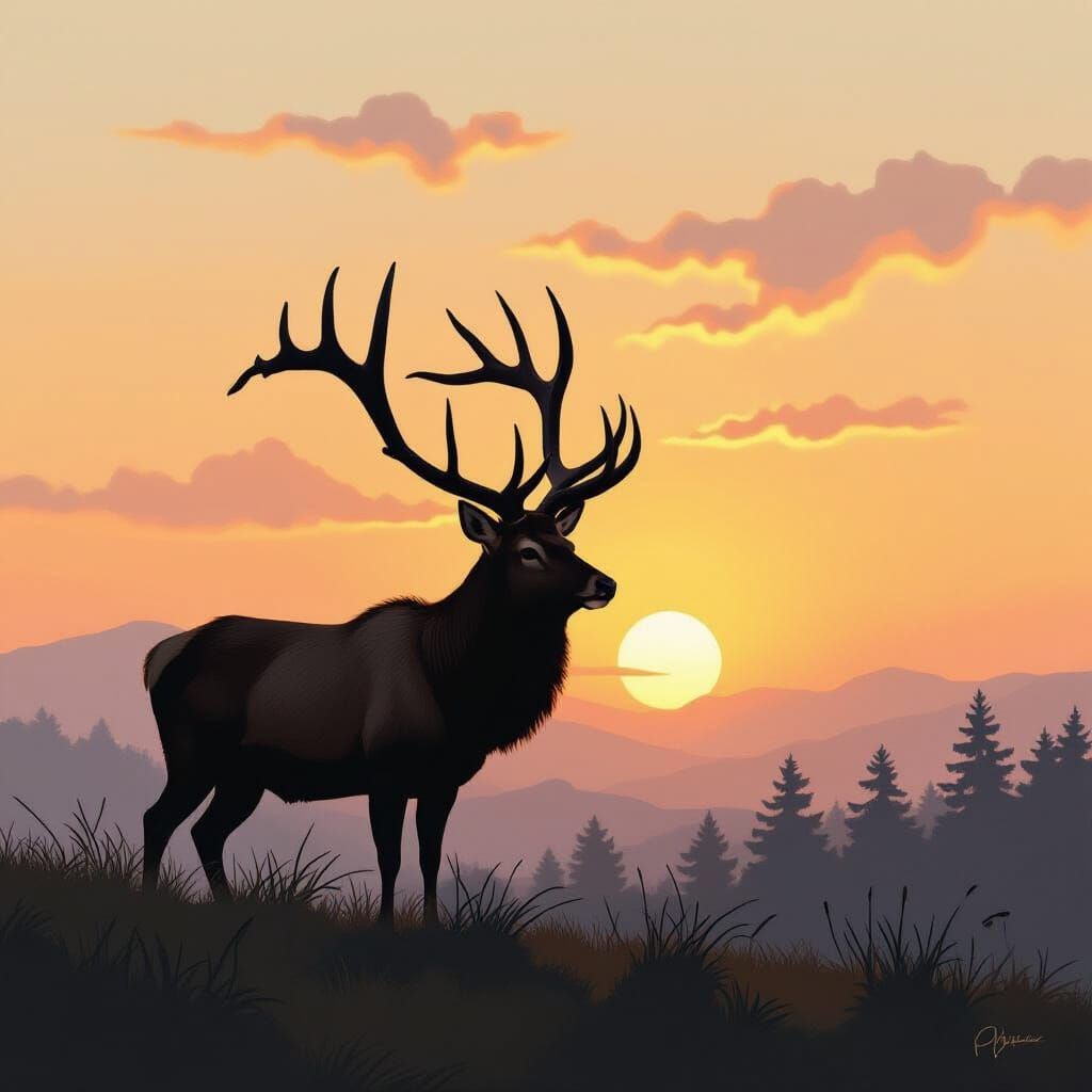 A majestic stag with detailed antlers is silhouetted against a soft, painterly sunrise, creating a mysterious and wondrous atmosphere with visible brushstrokes and rich textures.