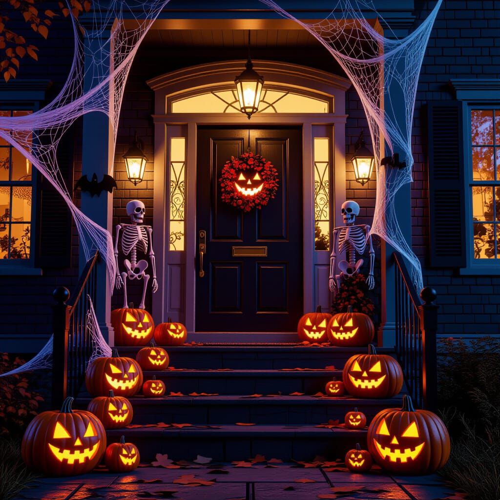 This 3D render showcases a front door and steps decorated for Halloween. Features glowing pumpkins, skeletal figures, and spooky lights with vivid colors and cinematic lighting.