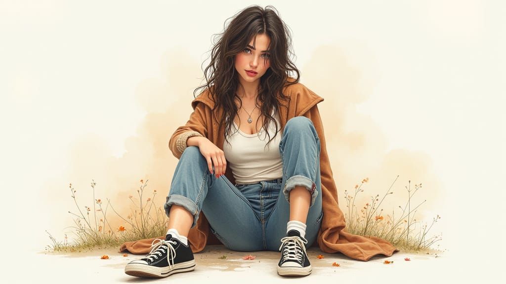 A woman with a mix of emotions, dressed in casual attire, sitting alone, surrounded by muted tones, wet-wash watercolour textures, and intricate, realistic colour pencil details.