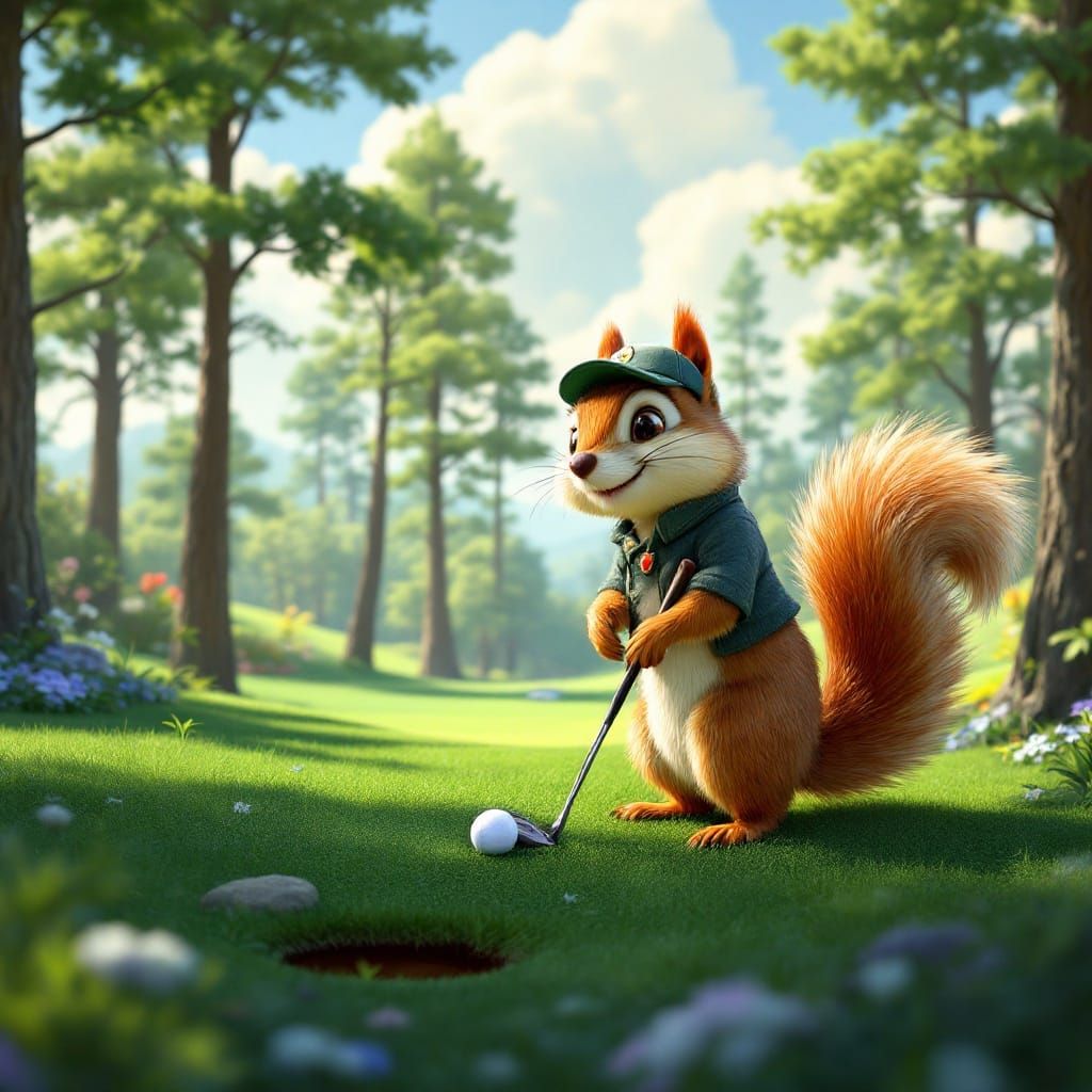 This enchanting image depicts a cinematic squirrel hitting a golf ball towards the flag hole on a lush, rolling golf course, with an upright bass and whimsical details blending realistic textures and vibrant colors reminiscent of classic animation and Pixar films.