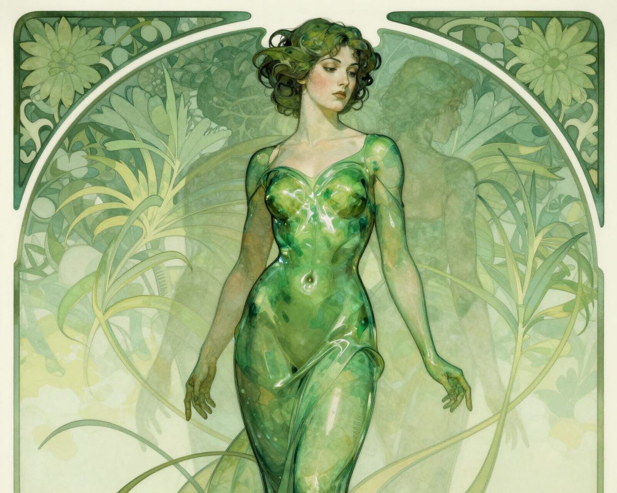 A striking illustration in an Art Nouveau style featuring an elegant woman in a sculpted green latex outfit. The art uses layered green tones and stylized botanical patterns.