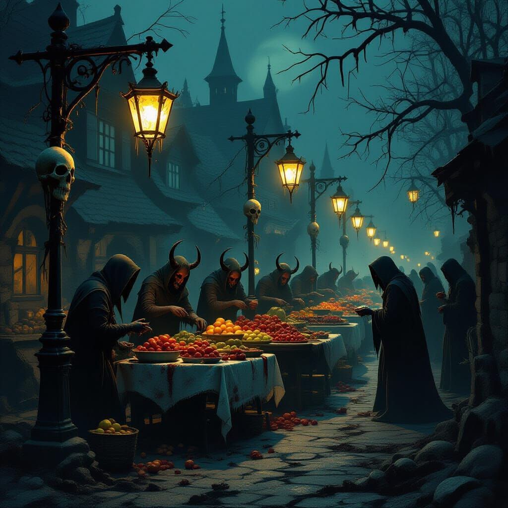 This image depicts a dark fantasy, gothic horror scene of devilish figures at a nocturnal festival. They haggle over rotten fruit under eerie bone lampposts, rendered with dramatic lighting.