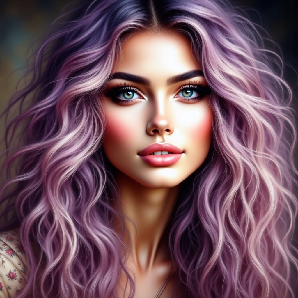 A striking picture of a beautiful woman with curly blonde hair featuring purple undertones and soft lips. The portrait showcases elegant makeup in a romantic aesthetic.