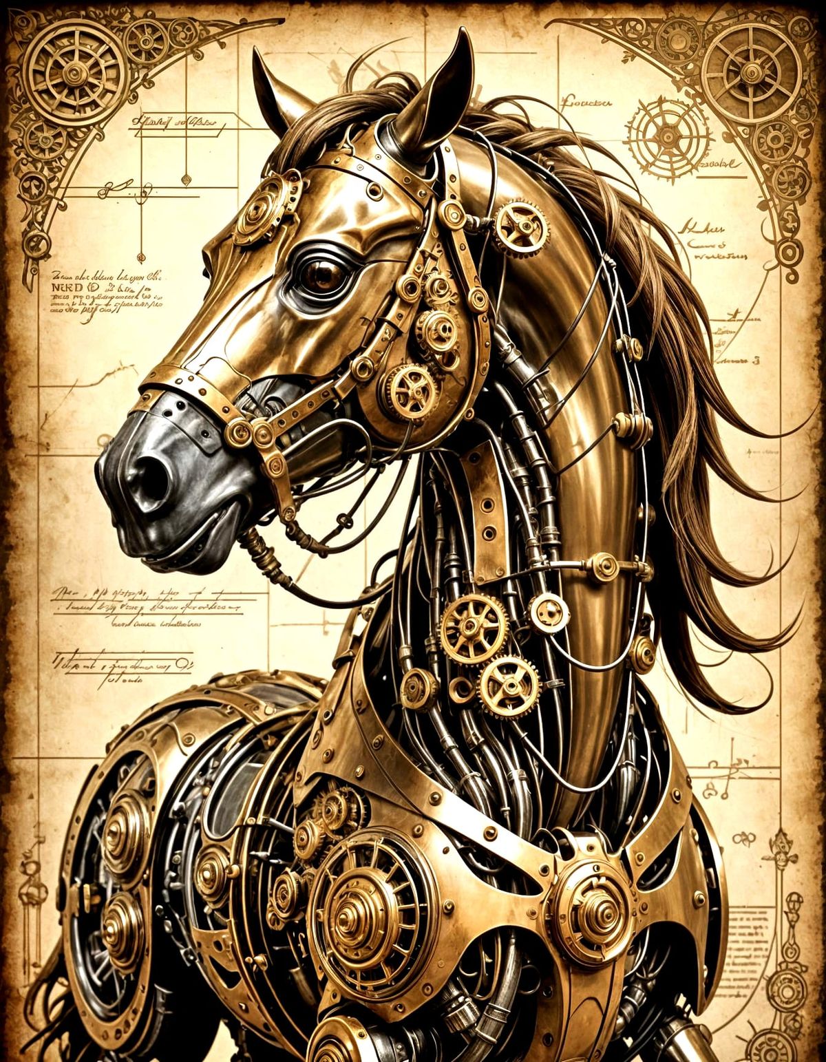 A striking picture of a mechanical horse head cyborg in the Victorian era. The robot features interconnected gears and wheels, rendered in warm copper and brass tones, in a steampunk aesthetic.