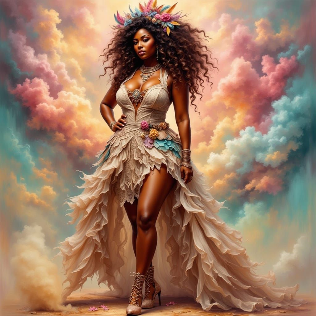 A full-body airbrushed illustration of a curvy African American woman in an Edwardian-Bohemian punk blend, featuring ombre curls and a feathered headpiece. The outfit combines lace, ruffles, leather, and chains.