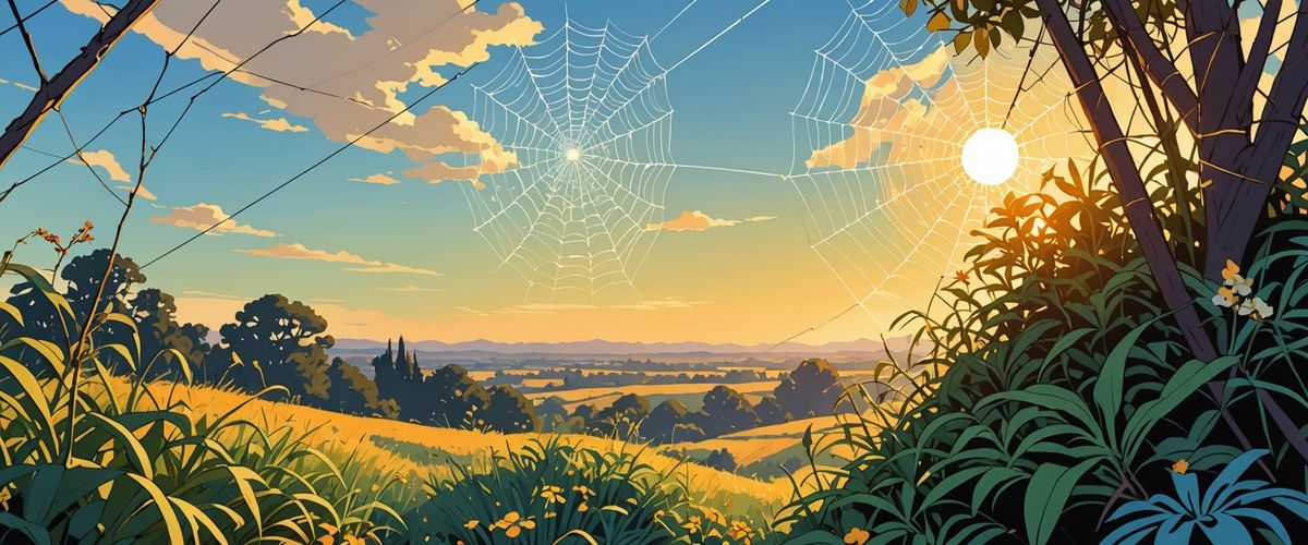 A vibrant image of spiderwebs glistening in the sunlight against a backdrop of exotic plants and flowers. Rendered as watercolor and gouache art with volumetric lighting, reminiscent of comic book styles.