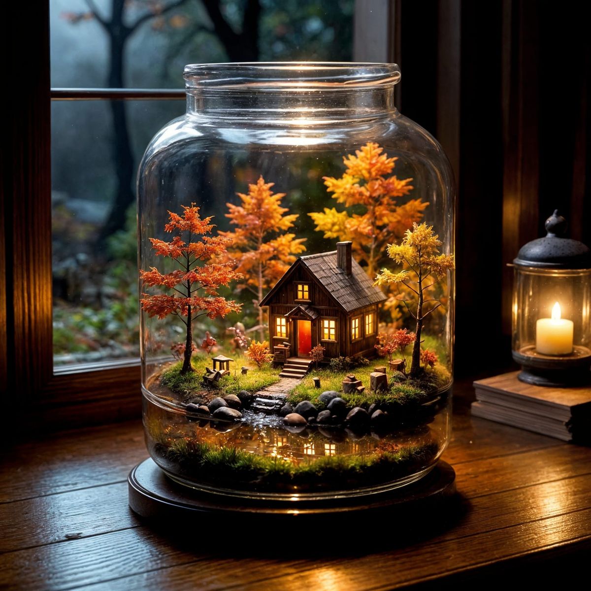 This image shows a detailed miniature autumn landscape with tiny trees and cottages sealed within a glass jar. Warm light emanates from within, illuminating the scene against a dark background.