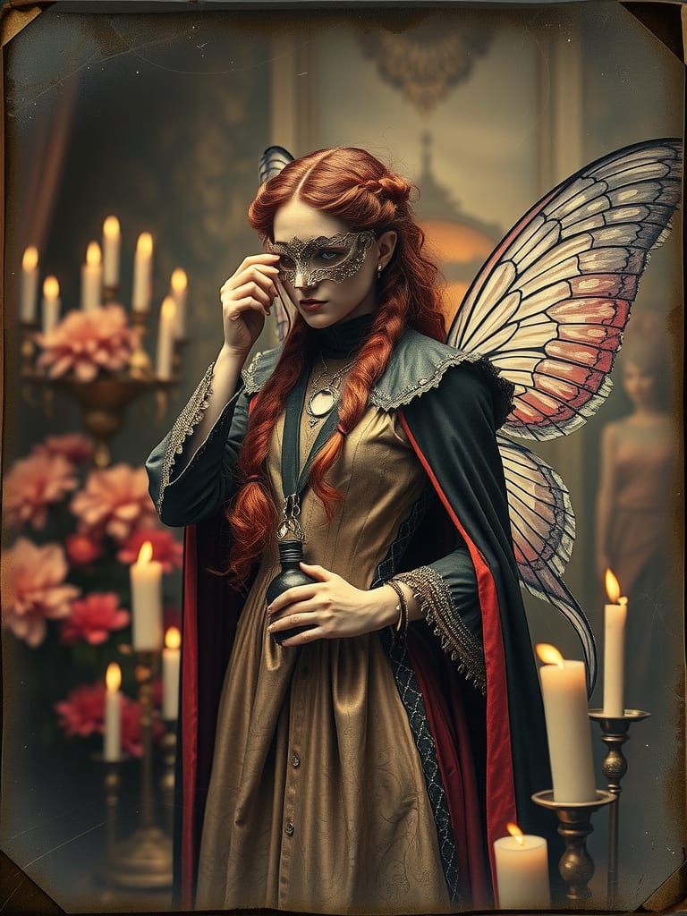 This image shows a double exposure portrait of a female android in the style of an antique daguerrotype. The robot is adorned with wings and jewelry in an opulent, candlelit room.
