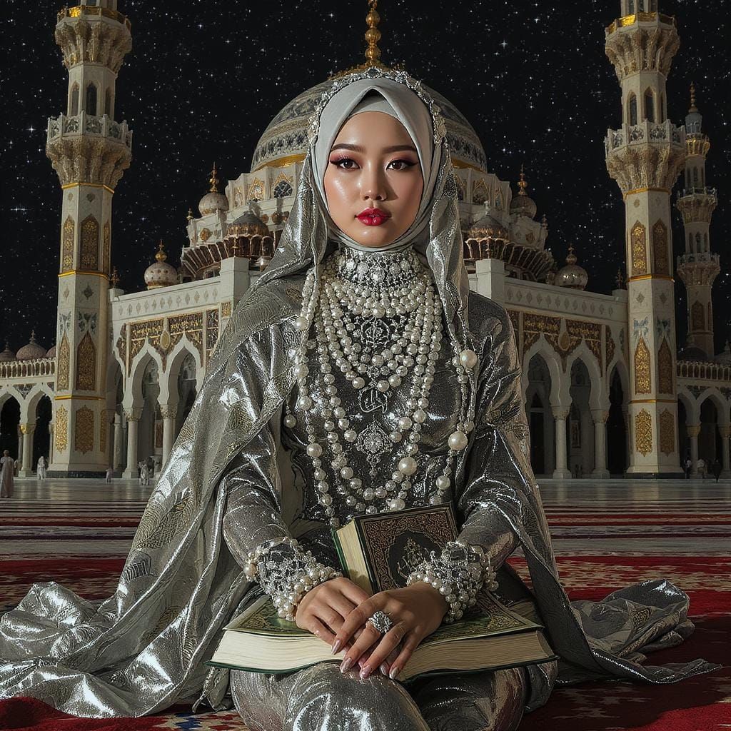 This image shows a woman in hijab and silver catsuit, adorned with pearls, sitting before the Ka'ba. The artwork features elements of surrealism and clean, futuristic design.