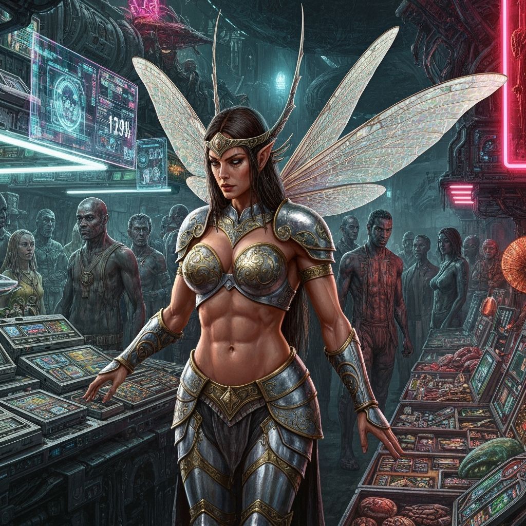 This image shows a strong, winged fairy warrior in shining armor at an alien market. The scene blends fantasy and advanced technology with dark, surreal art elements.