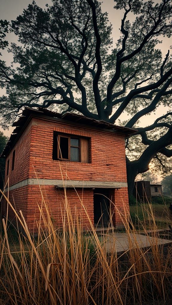 A low-angle, ultra-wide view of a decaying two-story Bengali home. Weathered bricks and plaster, a broken window, and a collapsed roof are visible under a moody sunset sky, captured in a photorealistic film style.