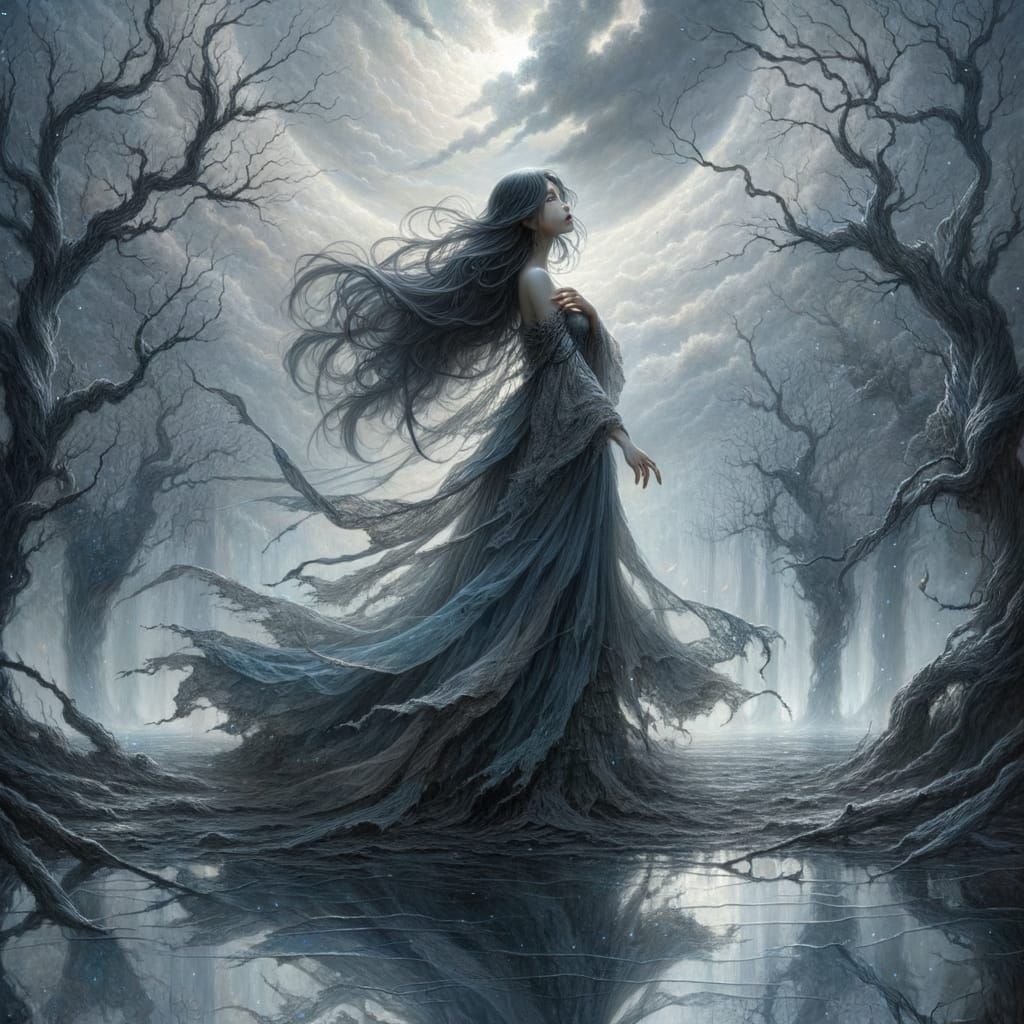 This image depicts a South Asian woman in a tattered blue and grey gown on a cliff edge, with a dark, magical forest below. The surreal sky and subdued colors create an otherworldly aura.