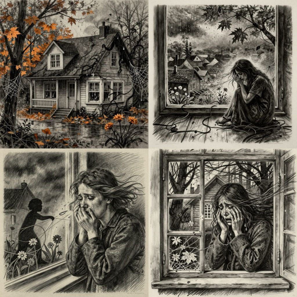 This image is a hyperdetailed charcoal drawing depicting a somber autumn scene. It evokes feelings of sadness and introspection, with a focus on the melancholic atmosphere of the season.