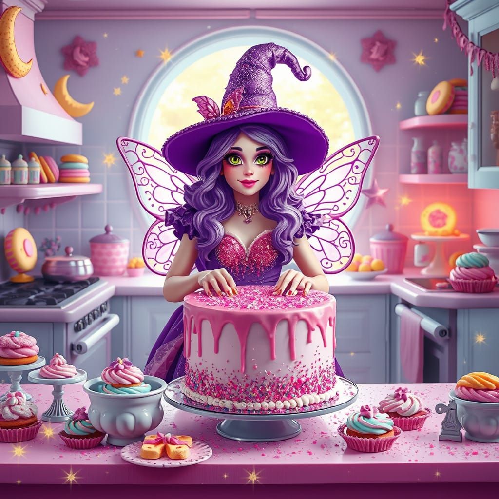 This image depicts a whimsical pastel kitchen scene with a fantasy witch baking a glittery cake. The scene is filled with cosmic desserts, edible stars and moons, and glowing sugar decorations, rendered in a 90s candycore style.