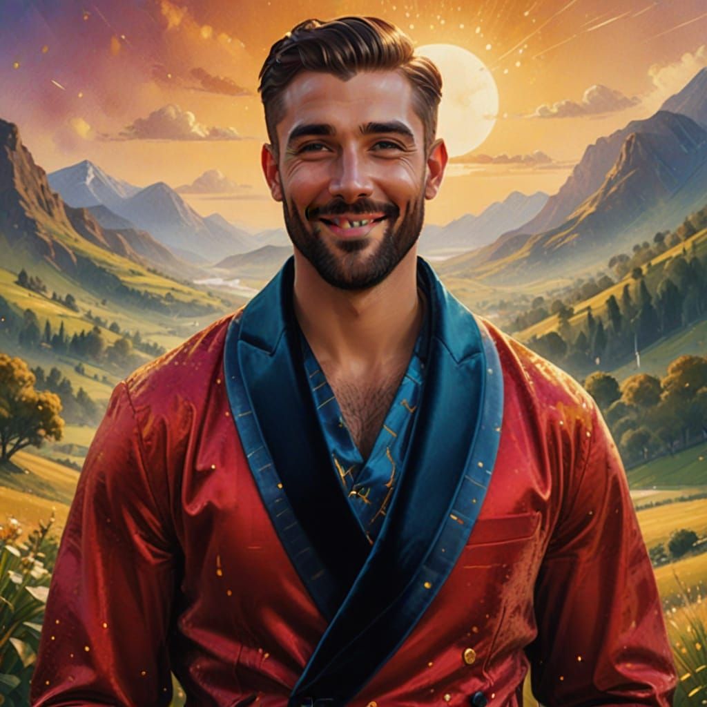 A portrait of a handsome man with a short haircut and side quiff smiling joyfully. This vibrant digital art piece features dim golden lighting and textures of silk and velvet.