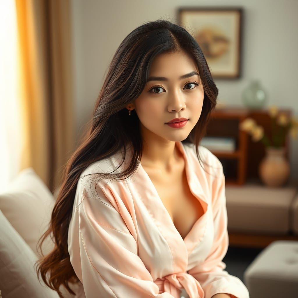 This serene image depicts a young Chinese woman in a peaceful living room setting, surrounded by warm tones and textures, exuding a sense of quiet elegance and inviting intimacy, reminiscent of Impressionist and Realist styles.