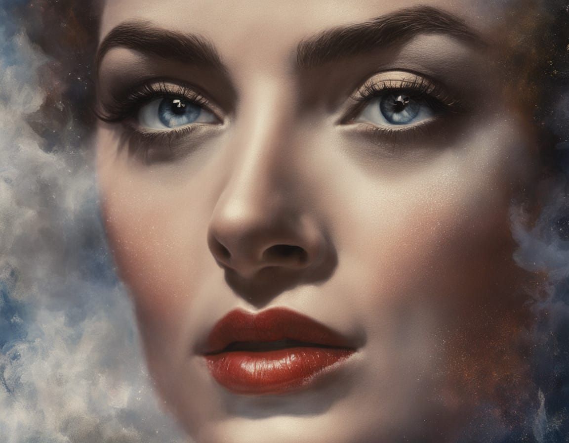 A striking portrait reminiscent of a 1940s movie poster. The artwork blends hyperrealism with elements of surrealism and fantasy, rendered with intricate detail in an impasto style, with complementary colors.