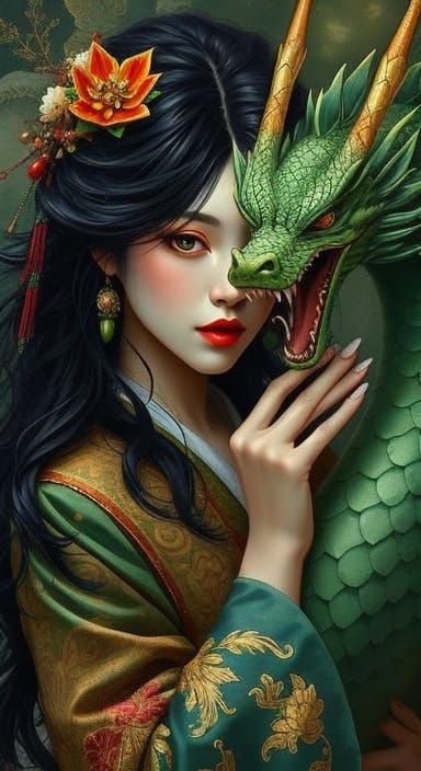 A striking picture of a Japanese woman embracing a green dragon. The woman is wearing traditional jewelry and an intricate gold kimono in this work of fantasy art. The art style is dreamlike with soft lighting.