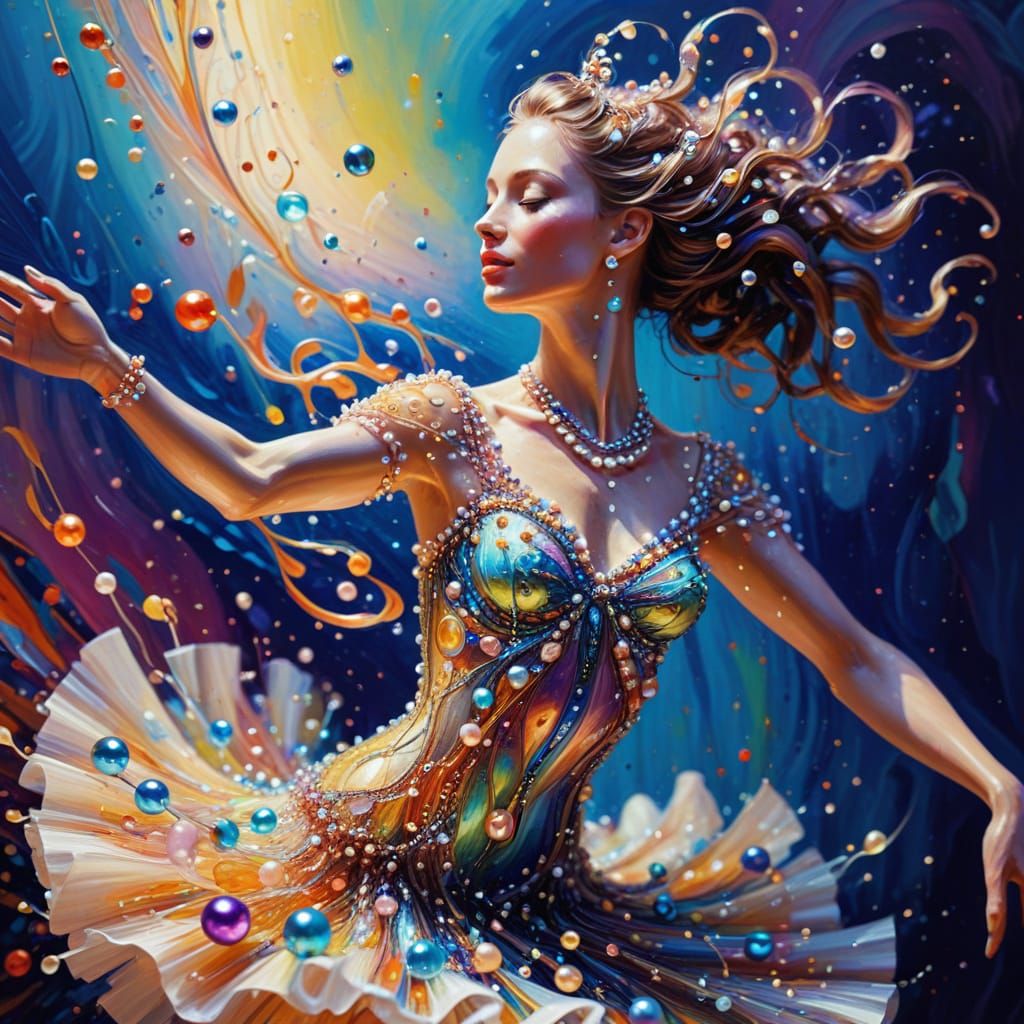 This image shows a close-up oil painting of a dancer composed of vibrant, colorful pearls. The fauvist expressionism style is emphasized by energetic movement, dynamic light, and iridescent sheen.