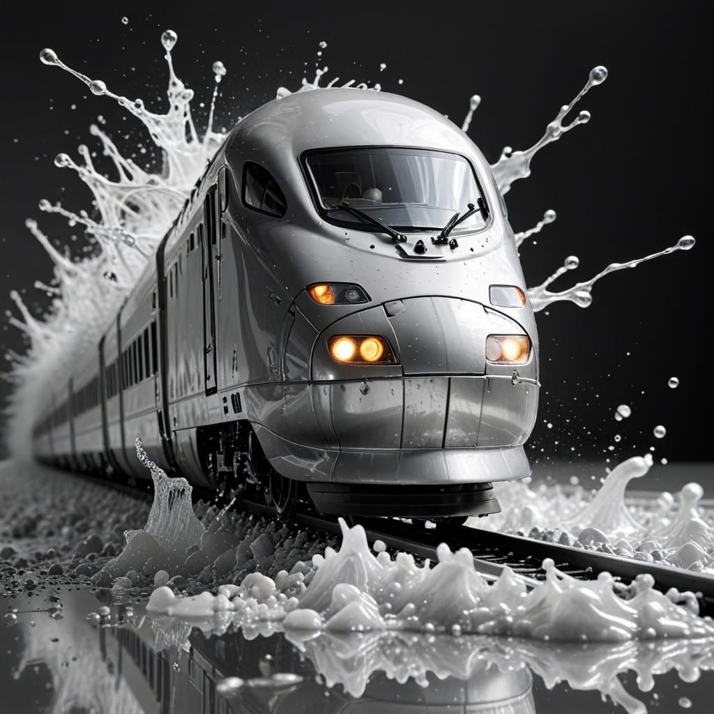 This image captures a dynamic gelatinous splash resembling a sleek silver bullet train in motion, showcasing fluid dynamics and abstract artistry.