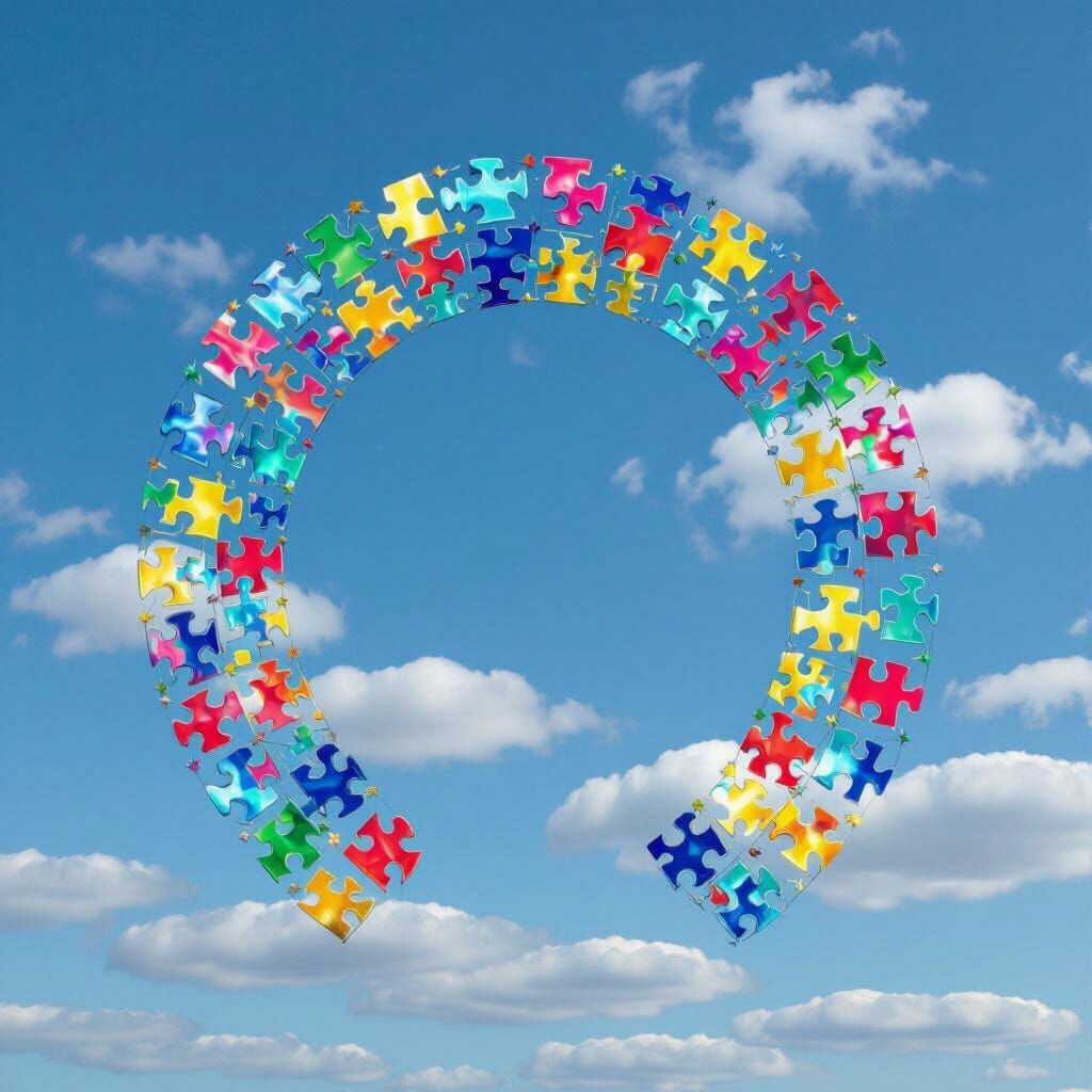 A surreal image shows a rainbow in the sky made of puzzle pieces. The design incorporates transparency and distortion effects, in a surrealist style.