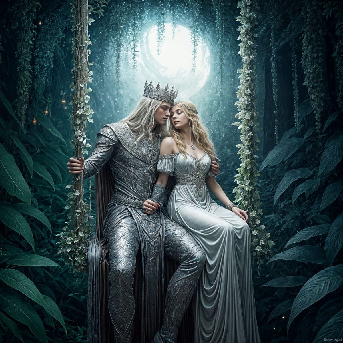 This image shows a silver king embracing a blonde woman on a swing in an underground realm. The scene has soft lighting, intricate details, and a magical, otherworldly glow in an ethereal fantasy style.