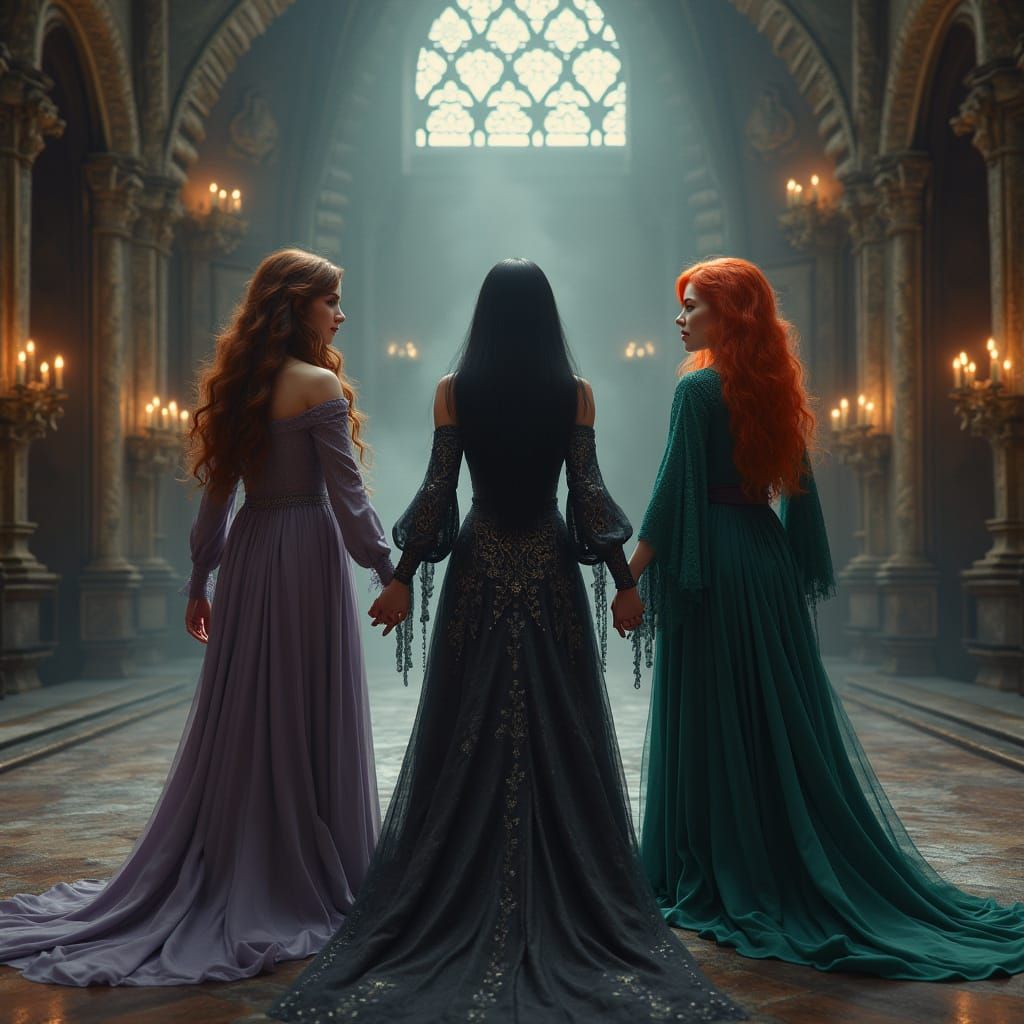 This enchanting fantasy art piece depicts three witches standing in a mystical circle, surrounded by an aura of magic. Hermione wears a dark lavender wedding ensemble, while Pansy dons an elegant black and silver gown, and Ginny's fiery red locks complement her deep emerald robes. Inspired by Simon Stale...