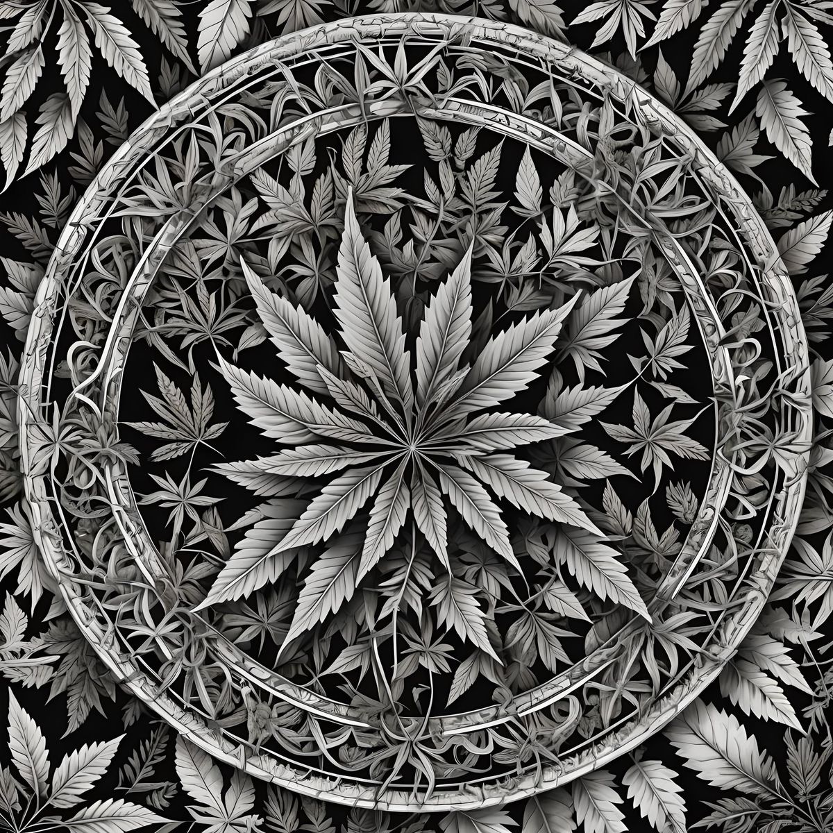 This image features an intricate cannabis mandala, rendered as a black and white outline, perfect for use as a coloring page for adults and children.