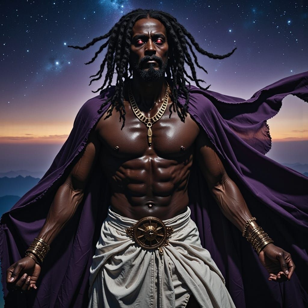 Majestic dark brown skinned male god. Muscle's fresh from workout. Sun cascading off muscles. The wind breaks against his muscles, disappearing in the wind. Shirt garment torn. Prada style Shirt garment blowing in the wind. Copper necklace. Gold choker on neck. White and black ombre cape attached to ...