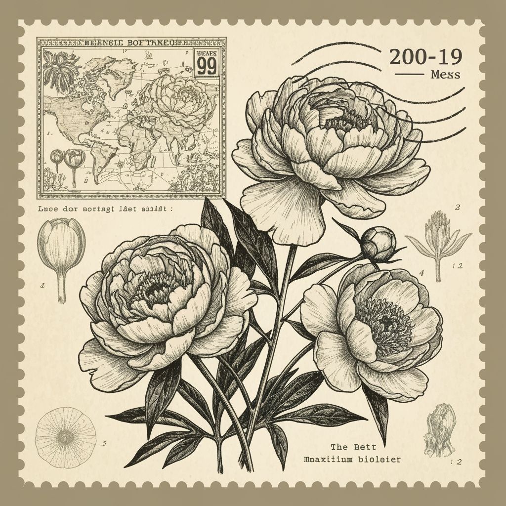 This image shows a vintage postage stamp featuring highly detailed peonies in a botanical art style. The design blends scientific illustration with watercolor and pastel techniques, incorporating delicate hues and dark botanical elements for a nostalgic charm.