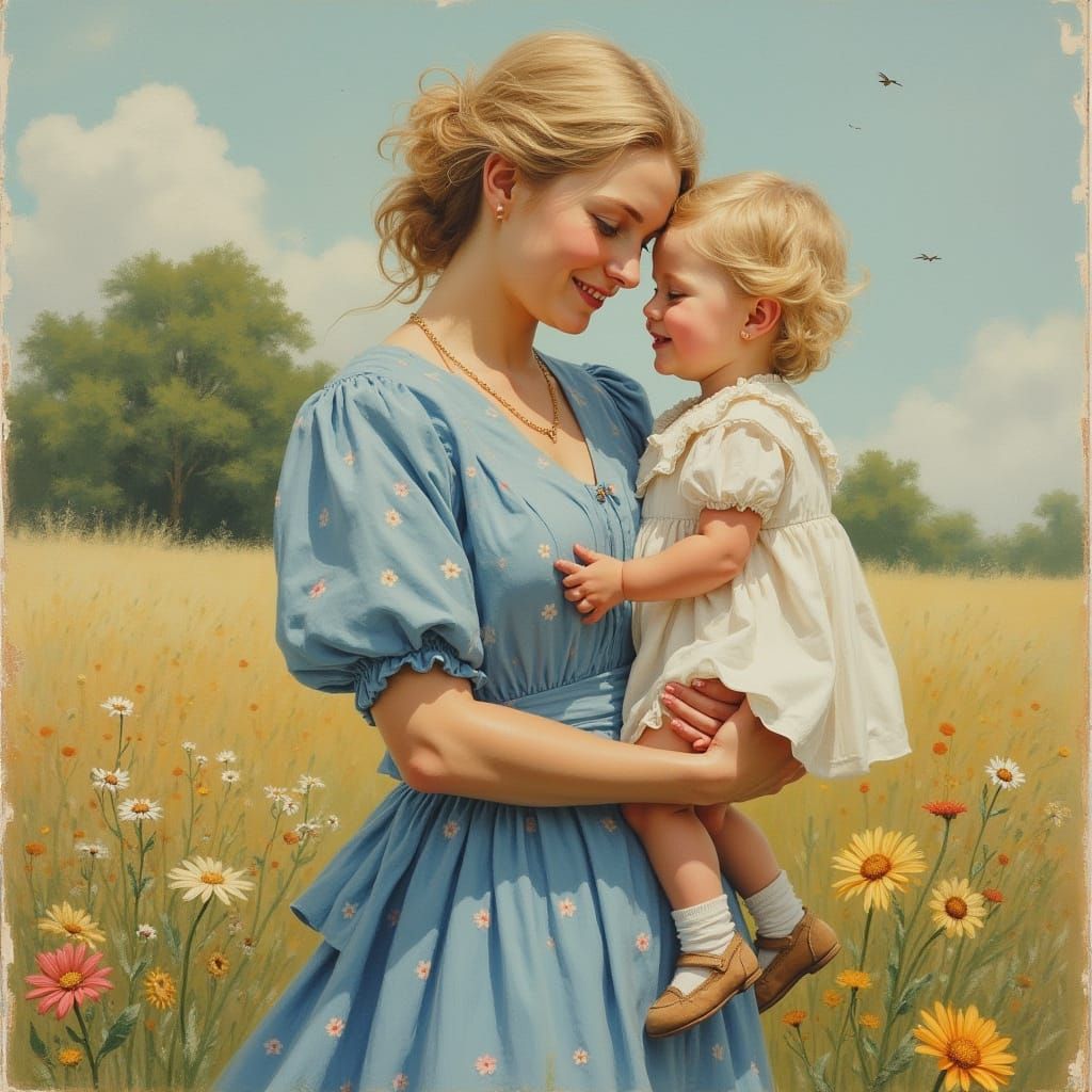 This heartwarming image depicts a serene European mother embracing her child, set against a warm and intimate atmosphere reminiscent of a traditional oil painting.