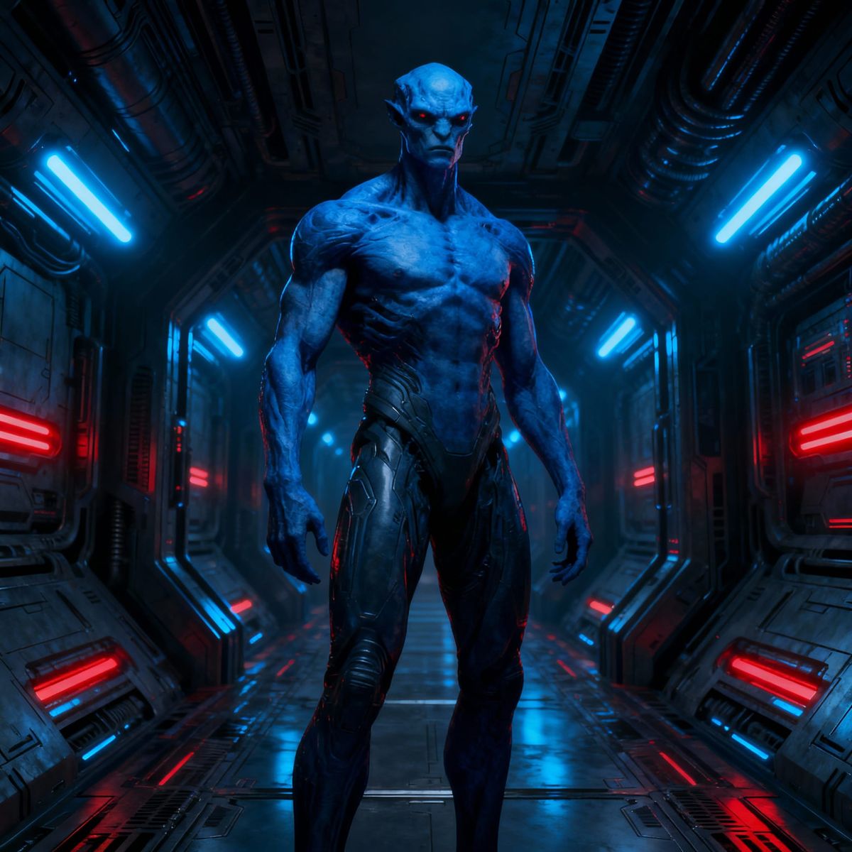 This image showcases a muscular, blue-skinned alien in a dimly lit, metallic space station corridor. Created in a detailed sci-fi concept art style, it features dramatic lighting with blue and red accents.