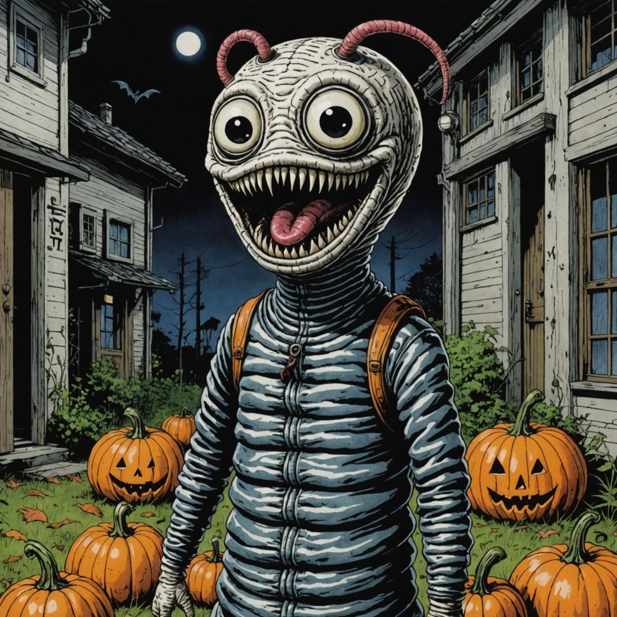 A detailed color ink drawing of a worm in a Dracula costume, inspired by horror manga art. This masterpiece captures a unique Halloween-themed scene.