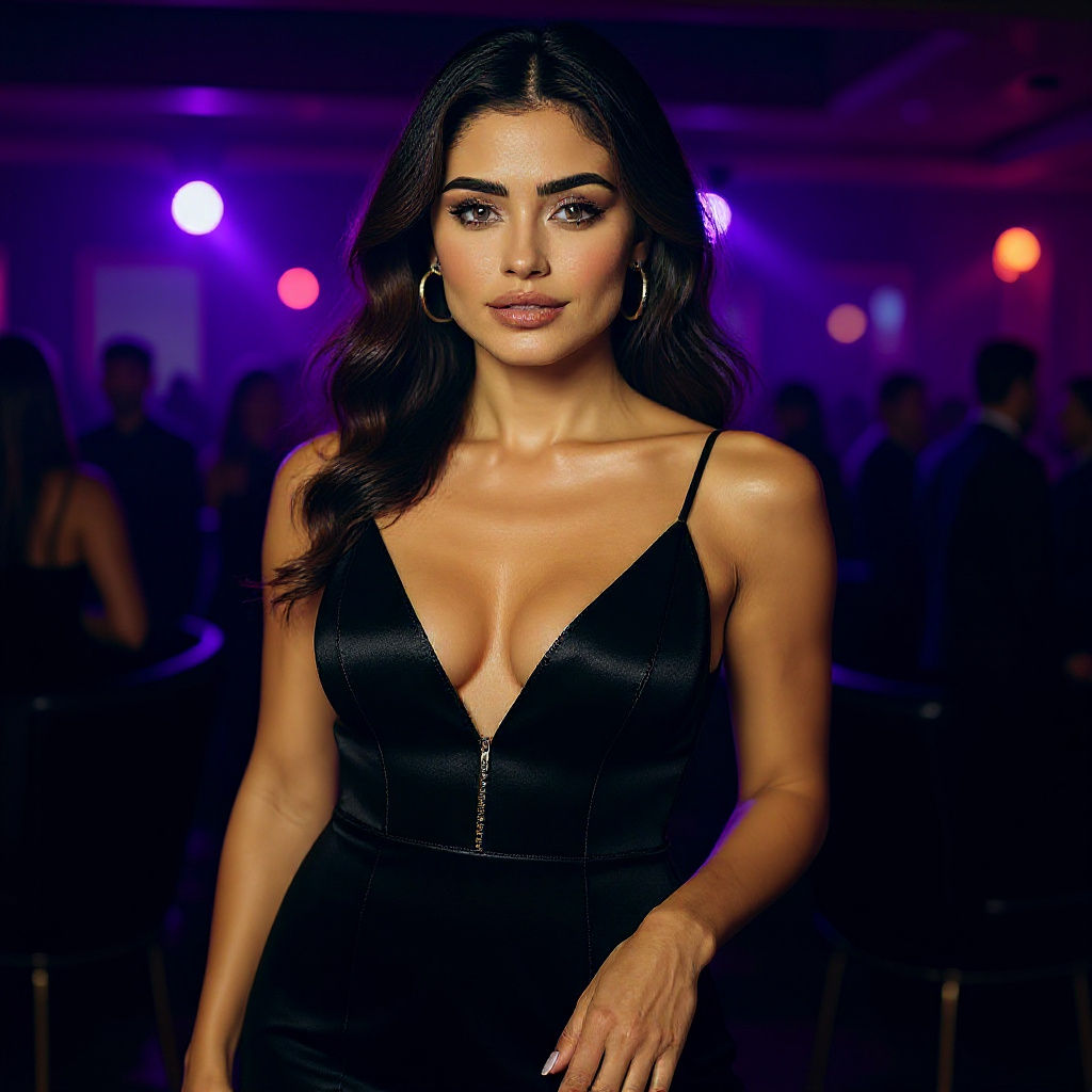 A stunningly realistic portrait of a young woman with flowing dark hair and hazel eyes. Photorealistic detail and cinematic lighting capture her confident pose, inspired by Vogue photography.