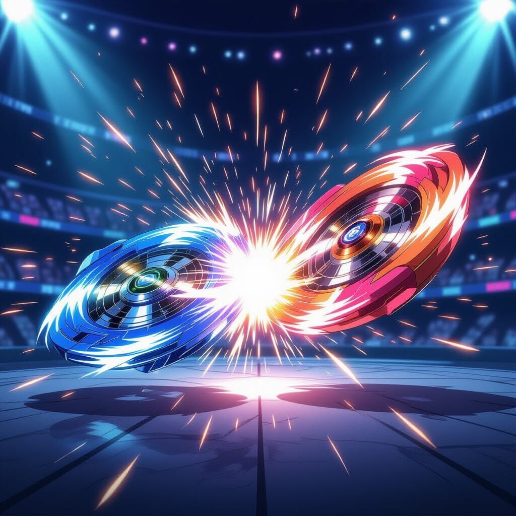 A dynamic anime scene depicts two beyblades clashing with glowing energy and light trails. Sparks fly in a dark arena, illuminated by vibrant colors, reminiscent of 90s animation and explosive action.