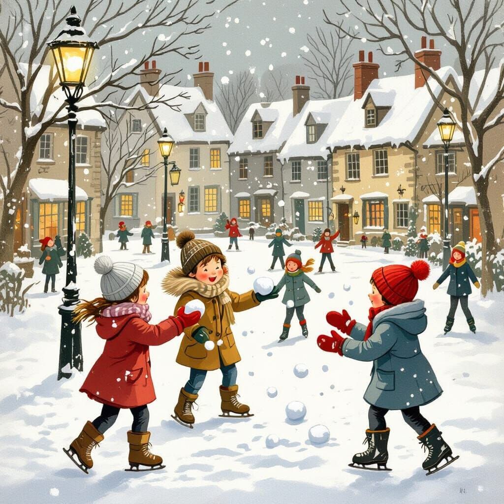 A delightful scene of children engaged in a snowball fight in a snow-covered village. The retro storybook style art features vintage lampposts and ice skaters, reminiscent of classic illustrators.