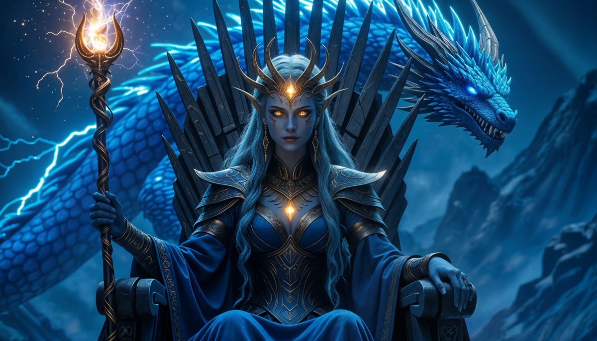 This image depicts an ancient goddess with golden eyes and celestial skin, seated on a starlight throne. A cosmic lightning dragon appears behind her. Rendered in epic fantasy concept art and digital painting styles with cinematic VFX.