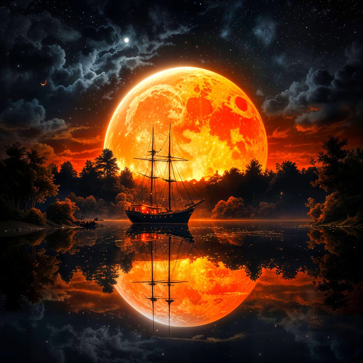 A surreal night scene features a giant, glowing orange moon over calm water. Luminous sails on a large ship and starry skies enhance this dreamlike, reflective landscape.