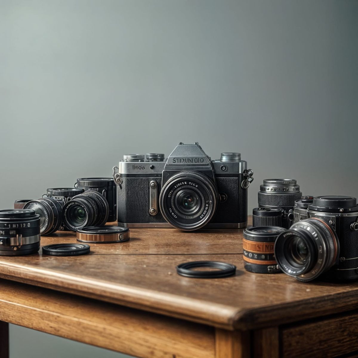 This image shows a vintage film camera on a wooden table, with antique lenses and film. Soft lighting enhances the details, set against a neutral gray backdrop. A vintage aesthetic.