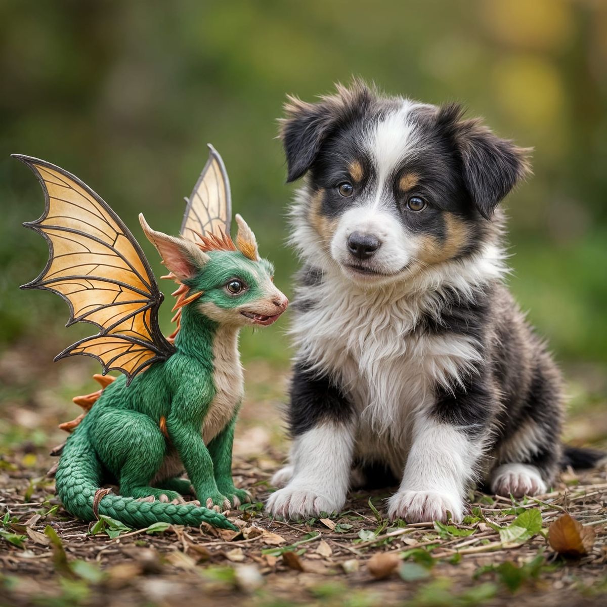 This image shows a small Border Collie puppy joyfully interacting with its magical fairy dragon companion, creating a heartwarming scene of friendship.