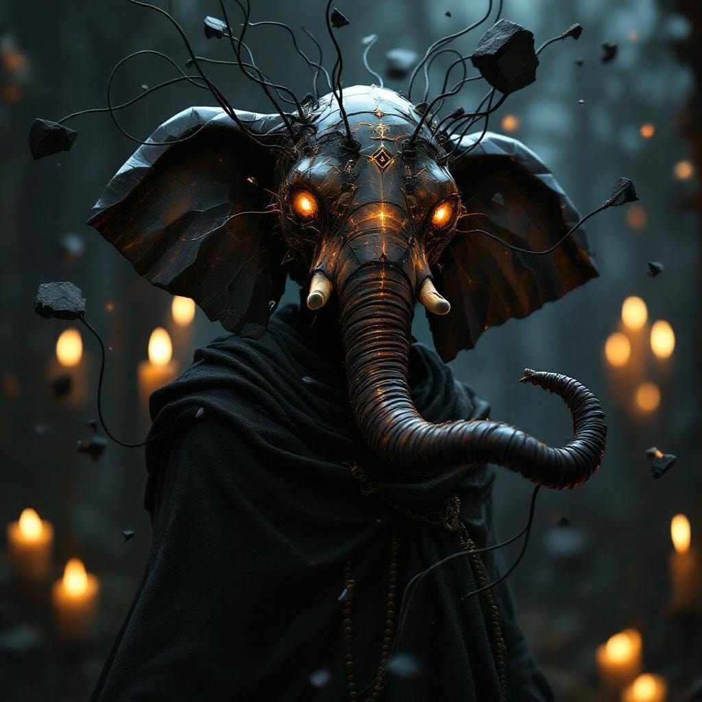 A 3D render of a robed figure wearing a tribal elephant mask. The mask is made of obsidian and iron oxide with wires coming out of it, set against a candlelit baroque dreamscape.