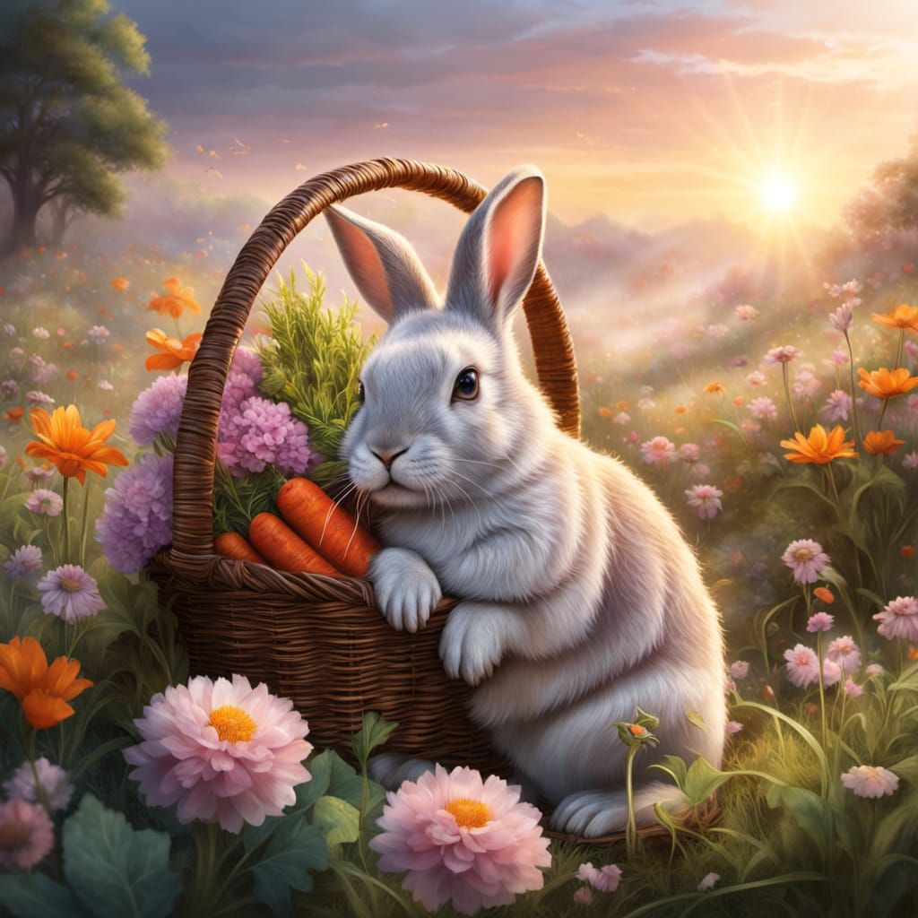 This image depicts a luminous rabbit nestled in a wicker basket brimming with wildflowers, carrots, and cabbage. Rendered in a digital matte painting style, it captures the enchanting glow of sunrise with soft, ethereal light.