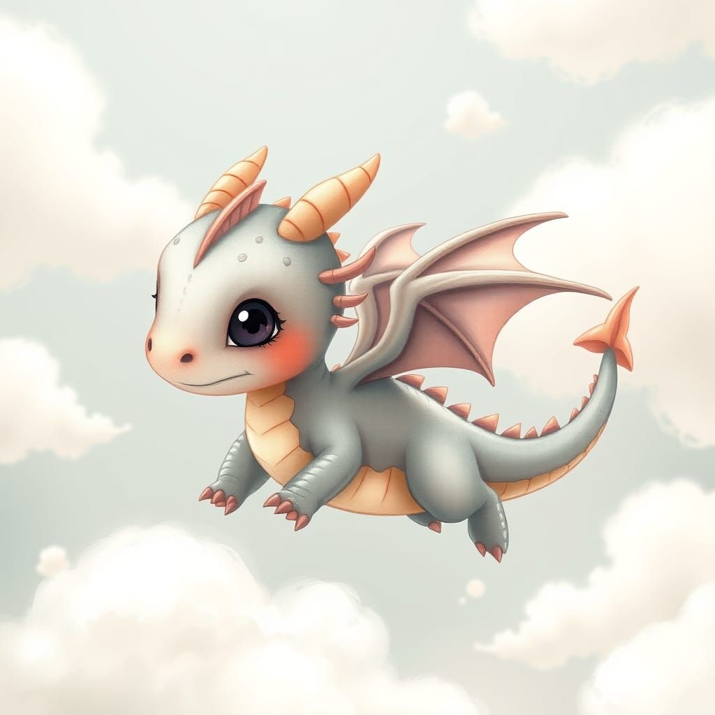 This image shows a charming baby dragon soaring amidst fluffy white clouds, depicted in a whimsical fantasy style. The artwork features soft pastel colors and gentle textures.