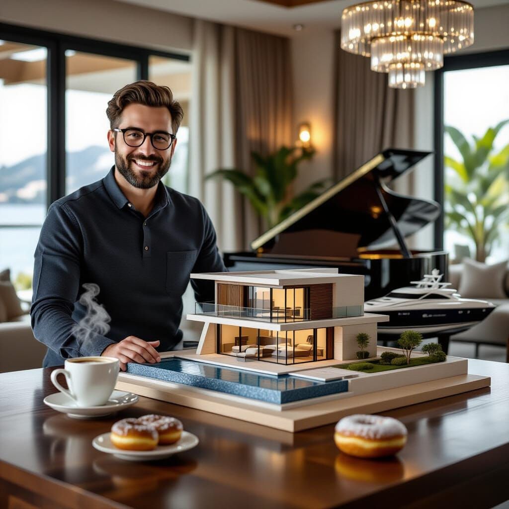 This photorealistic image captures a young architect proudly showcasing a large, detailed model of a Mediterranean home with a yacht and pool. A coffee cup and donuts sit nearby.