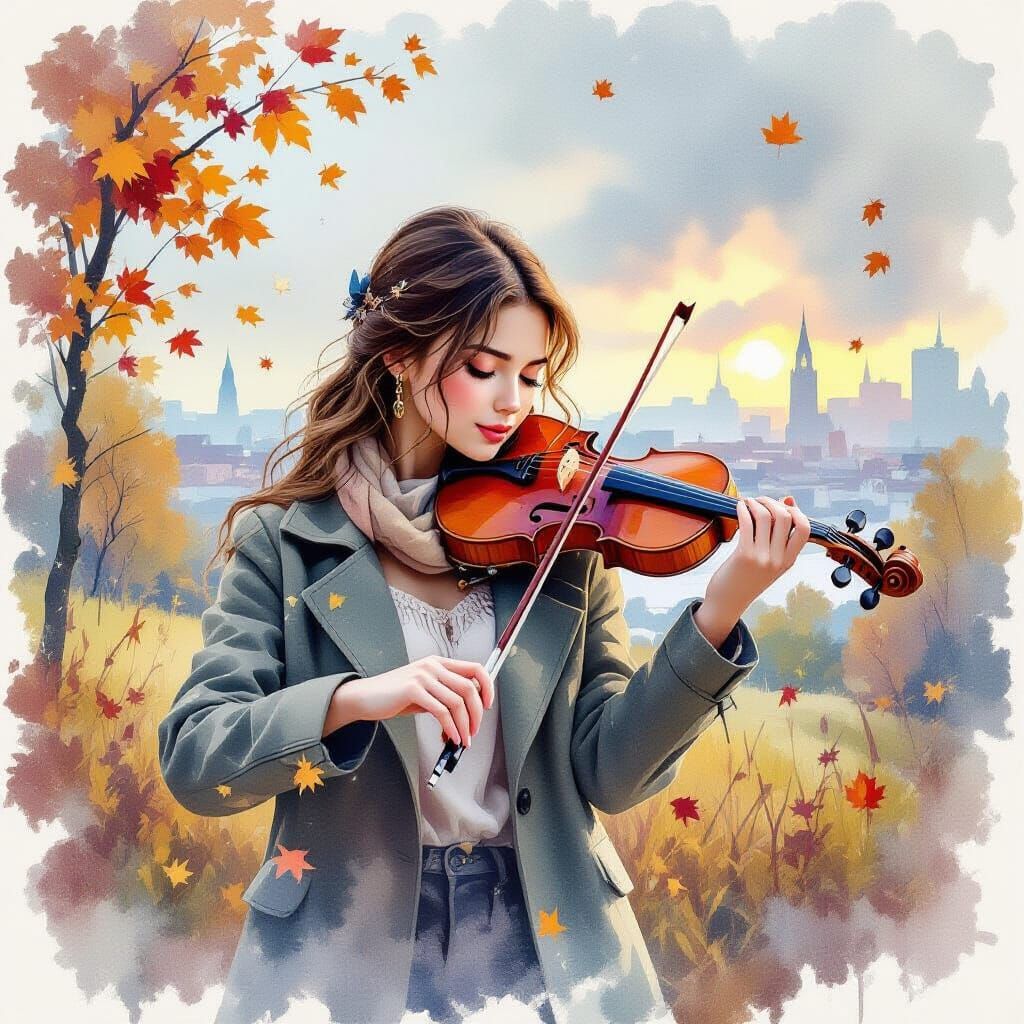 This image shows a girl playing the violin in a late autumn setting with falling leaves and light snow. It is rendered as a watercolor painting on an old manuscript, featuring sfumato effects and double exposure.