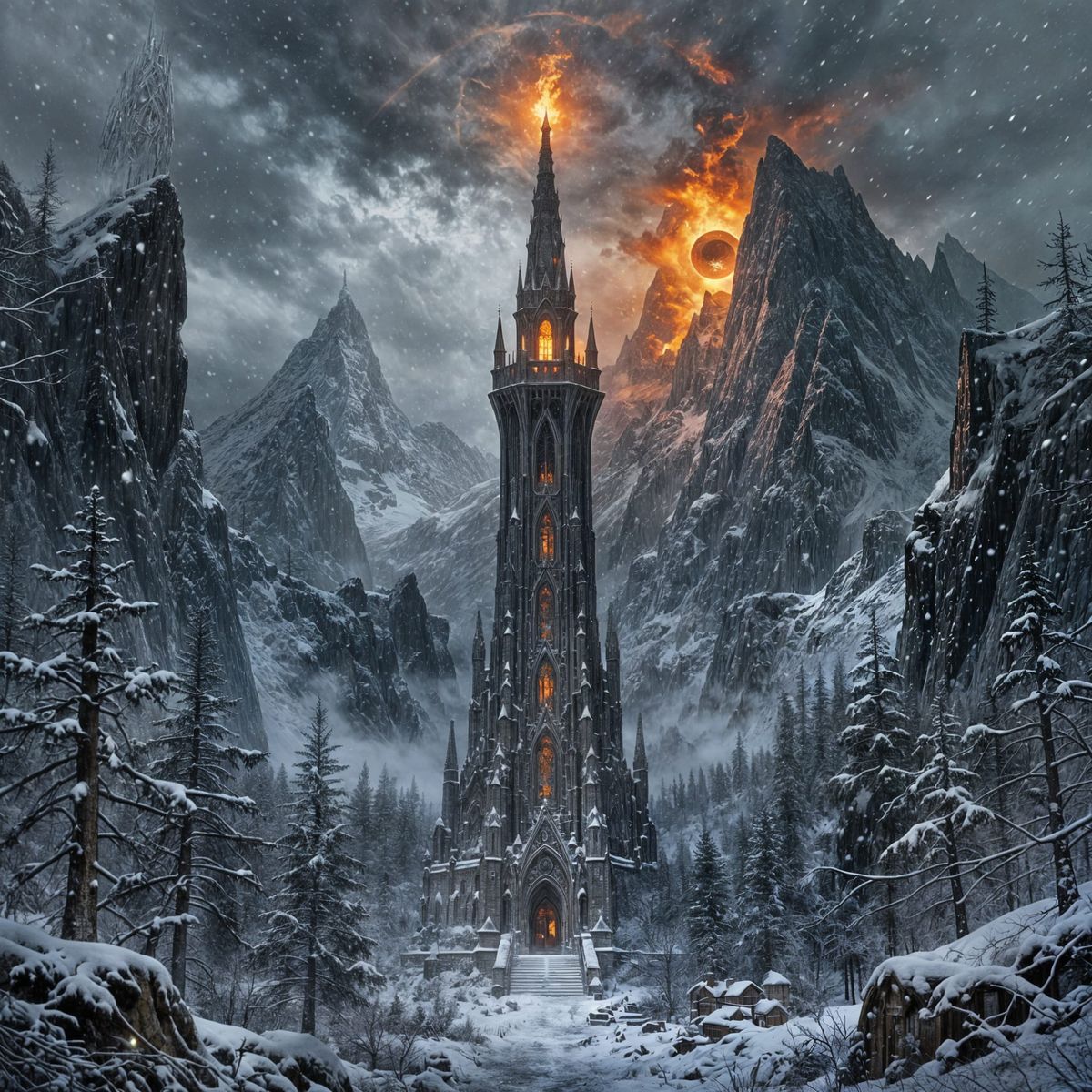 This image shows a majestic wizard tower in a snowy winter forest, surrounded by mountains. The sky is a striking silver, with a sense of foreboding from the Eye of Sauron visible in the peaks.