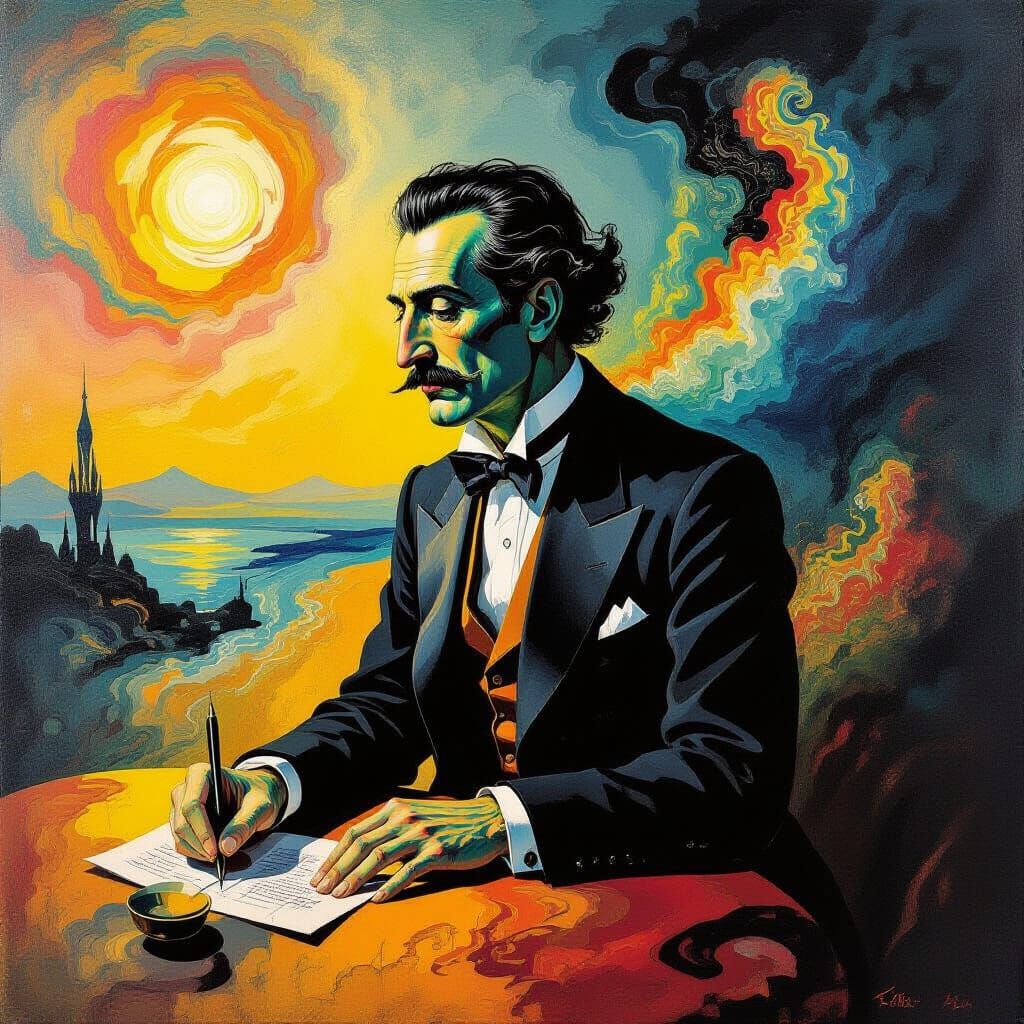 A surreal image of a troubled figure in a dreamscape. Swirling patterns and bold colors create a chaotic scene with melting forms in a surrealist style.