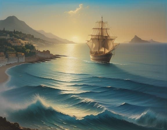 This image captures a Mediterranean coastline with majestic ships, mountains, and villas, rendered as an encaustic oil painting with textured brushstrokes and a warm, effervescent glow.