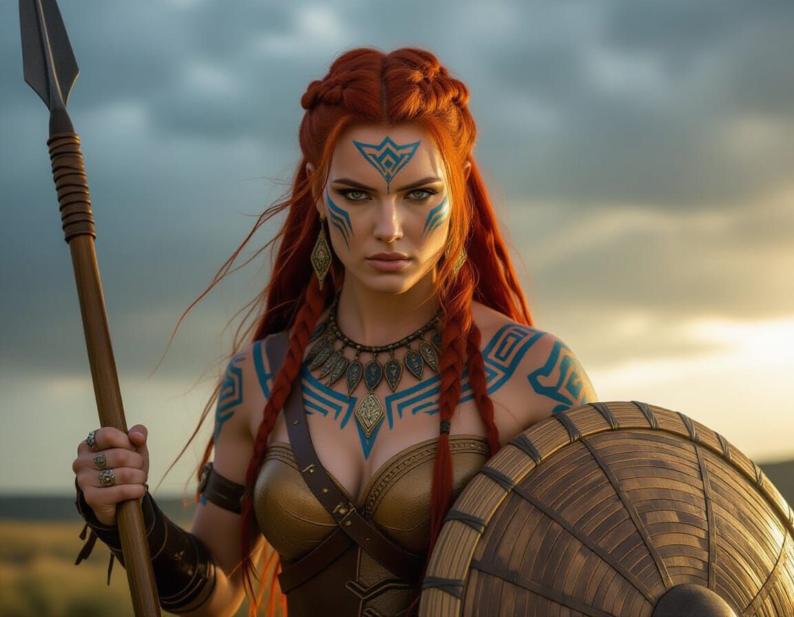 This photorealistic image shows a determined warrior woman with red hair and blue tribal tattoos, holding a spear and shield. Cinematic lighting highlights intricate details, set against a stormy sky.