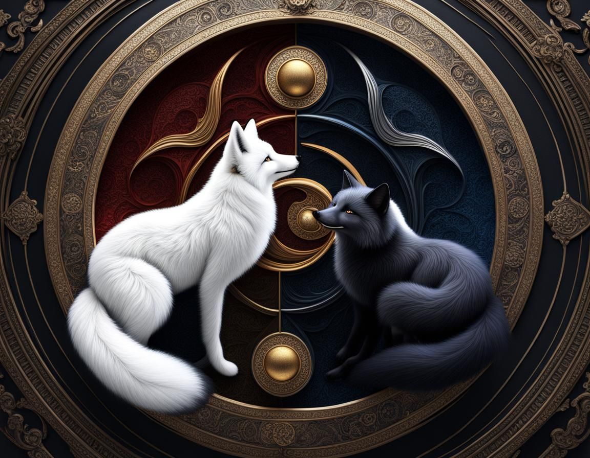 This image shows a yin-yang symbol formed by a white fox and a black fox chasing each other. It's a detailed, colorful piece of fantasy concept art.